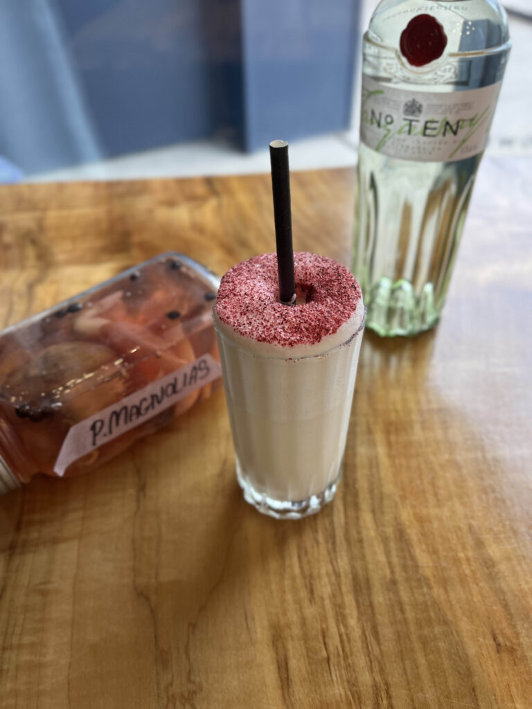 I created this cocktail to explore working with magnolia blossoms. They have a narrow window, and can be hard to find. I knocked on a neighbours door, and luckily they allowed me to pick some magnolia blossoms from their tree. The floral, and gingery flavour works great in this Ramos gin fizz variation featuring Tanqueray 10. Bright, citrusy, floral, and light.